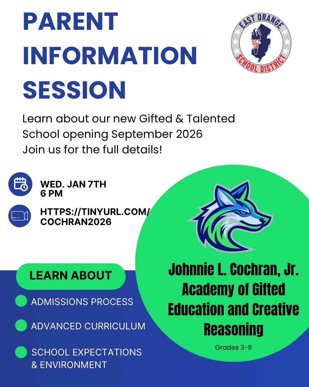 We are excited to formally announce the opening of Johnnie L. Cochran, Jr. Academy (190 Midland Avenue) for gifted and talented learners in September 2026 under the leadership of Dr. Renee Richardson. Dr. Richardson is the current principal of Althea Gibson Academy, and a Milken National Educator Award recipient. During her 27 years of distinguished leadership in the East Orange School District, Dr. Richardson has been a Teacher of the Year and earned recognition from the New Jersey General Assembly and Essex County School Boards Association.